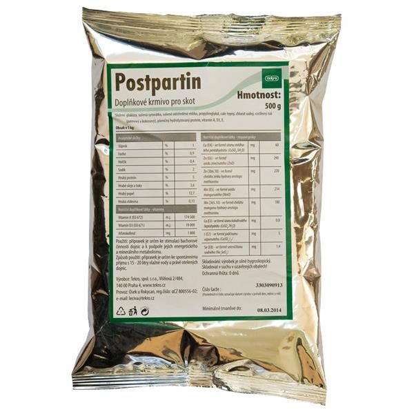 Vodorozpustný přípravek ke spontánnímu příjmu pro podporu zdravotního stavu otelených a nemocných krav. Minerální doplňkové krmivo pro otelené krávy a vysokobřezí jalovice a pro zvířata se zdravotními poruchami ve všech obdobích reprodukčního cyklu, pro dojnice s ketózou nebo jaterní steatózou. Přípravek se předkládá právě otelenému zvířeti ke spontánnímu vypití. Otelená dojnice by měla Postpartin přijmout před prvním napitím z napáječky.