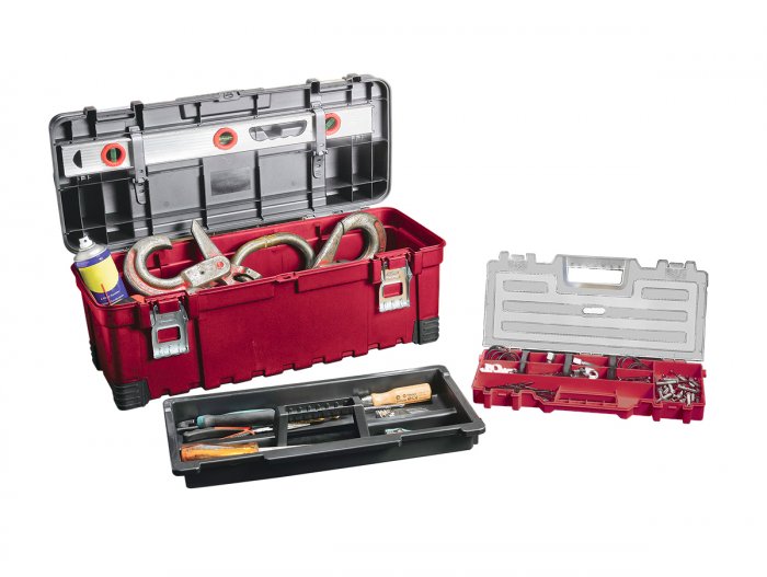 Praktická skříňka s velkým objemem. Její vnitřek umožňuje skladování nářadí různých velikostí. Organizéry uvnitř skříňky usnadňují organizaci práce a zajišťují snadný přístup k potřebnému nářadí. Díky pohodlnému držadlu lze skříňku bez problému přenášet.