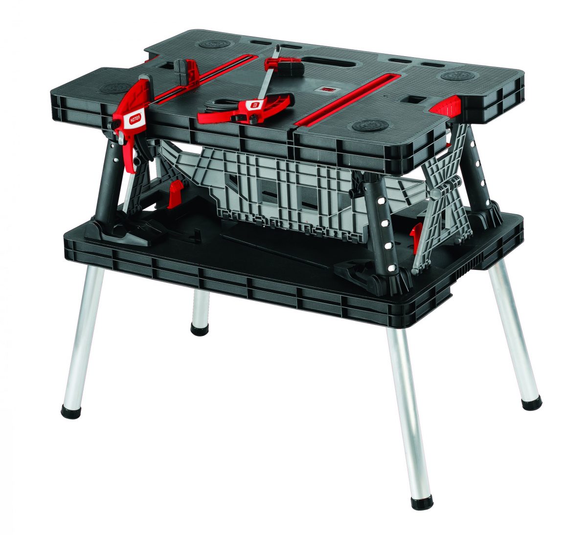 Praktický přenosný stůl umožňuje práci na různých místech. Výrobek disponuje speciálním systémem, který umožňuje rychlé rozkládání a skládání, což výrazně usnadňuje kutilství. Velká pracovní plocha stolu, odolnost do 453 kg / 1000 lbs zajišťují, že na něm můžete vykonávat také složité práce. V balení s výrobkem jsou dvě svorky 30 cm/12” Clamps, které zajišťují stabilitu pracovního povrchu.