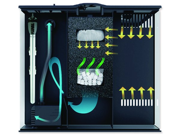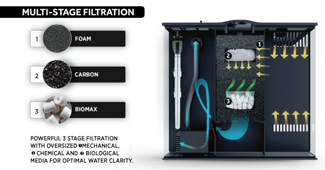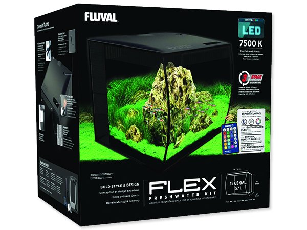 Akvárium Flex nabízí nejen moderní styl s jeho výraznou zakřivenou přední straně, ale je také vybaven výkonným vícestupňovou filtraci a brilantním LED osvětlením, které umožňuje uživateli nastavit mnoho barevných variací pomocí dálkového ovládání.