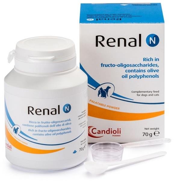 Renal N přináší frukto-oligosacharidy, polyfenoly olivového oleje, Enterococcus faecium a vitamíny, které prospívají zachování normálního metabolismu a adekvátní střevní funkce.