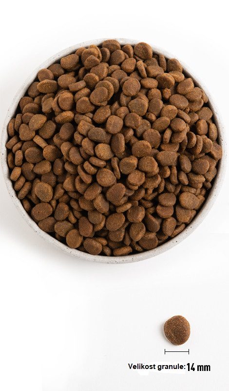 Hrubý protein 38 %, Obsah tuku 18 %, Hrubý popel 8.5 %, Hrubá vláknina 5 %, Vlhkost 12 %, Vápník 1.5 %, Fosfor 1.1 %, Omega-6 mastné kyseliny 2.1 %, Omega-3 mastné kyseliny 2.1 %, DHA/EPA 0.7 % / 0.5 %.