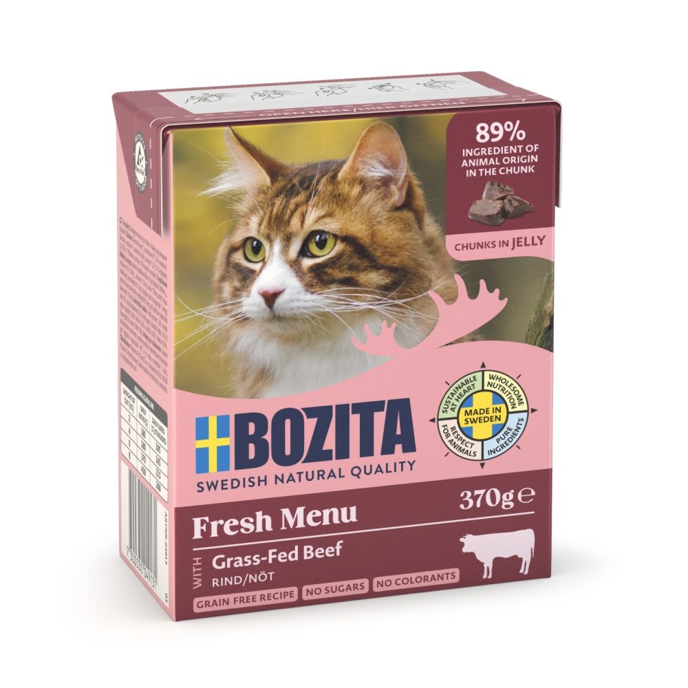 Kompletní krmivo pro dospělé kočky i koťata. Kousky v rosolu obsahují vysoký podíl čerstvého švédského masa (93%), jsou bezlepkové s nízkým obsahem tuku a mají přirozeně vysoký obsah taurinu pro kočičí oči a reprodukci. MacroGard, přírodní ß-Glukan, přispívá ke zlepšení imunitního systému.
