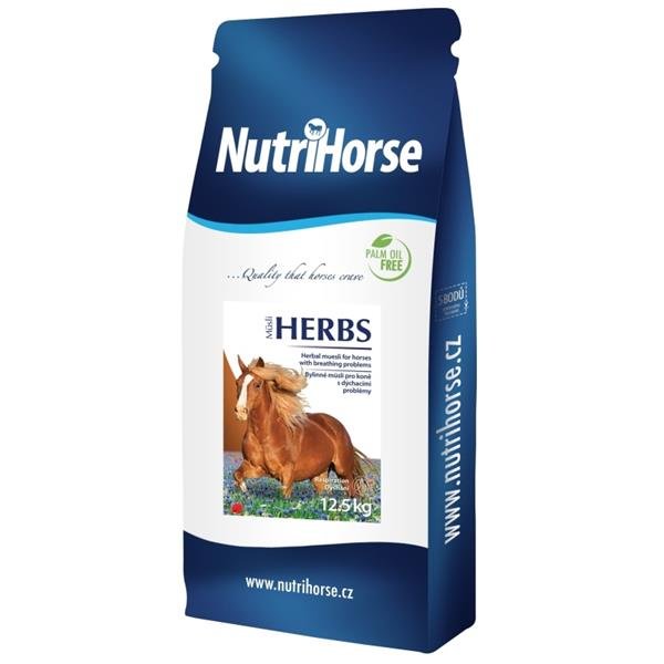 NutriHorse Müsli Herbs je výjimečné krmivo s obsahem vybraných bylin na podporu dýchání u koní. Posiluje přirozenou obranyschopnost organismu, pozitivně působí na průdušky a uvolňování hlenů. Pro lepší účinnost je vhodné müsli zalít horkou vodou, nechat zchladnout na cca 42 °C a nechat koně při žraní inhalovat páru.