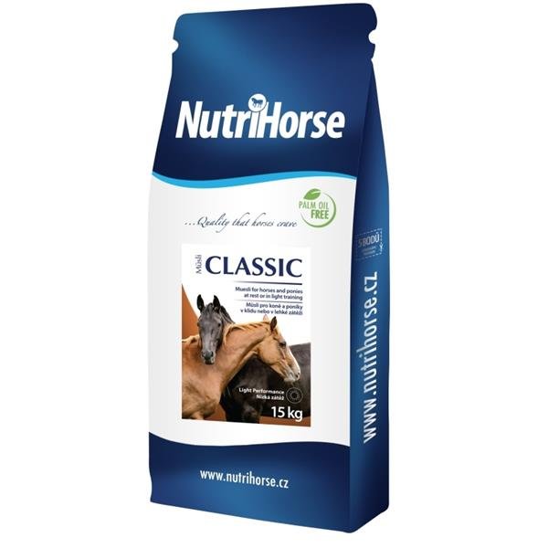 NutriHorse Müsli Classic je chutné a cenově dostupné müsli se všemi potřebnými živinami včetně vitaminů, minerálních látek a stopových prvků pro poníky a koně bez větší zátěže, tzn. koně určené pro rekreační ježdění, koně do lehké zátěže, na odpočinku nebo v rekonvalescenci. Svým složením udržuje koně v požadované kondici a zdravotním stavu.