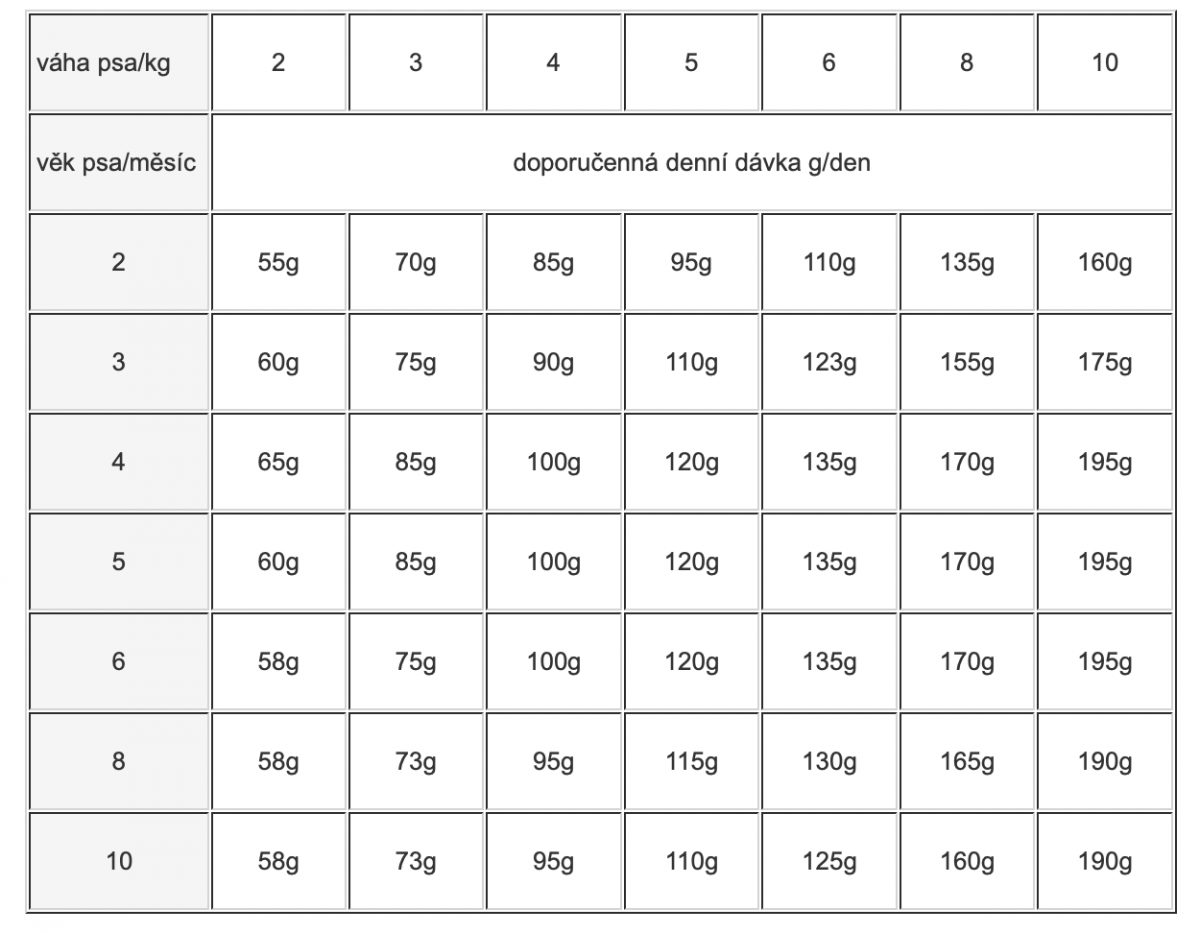 Pro štěňata od 6 týdnů do 12 měsíců, namočte do teplého mléka nebo vody několik minut před krmením. Denní krmná dávka by měla být rozdělena do 3 – 4 porcí a může být měněna s ohledem na potřeby štěněte. Březí a kojící feny: zvyšujte běžnou denní dávku od začátku o 10%, následně pak v posledním týdnu březosti o 25% a udržujte zvyšování dávky během celé březosti. Vždy zajistěte čerstvou vodu.