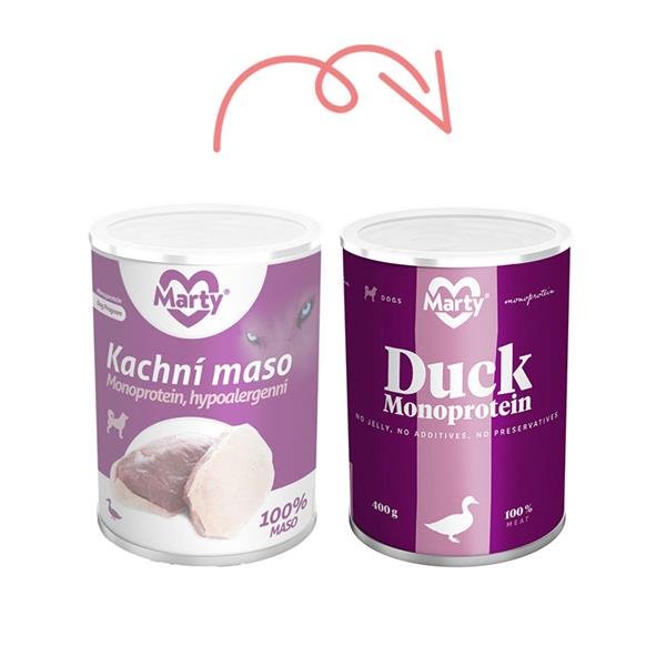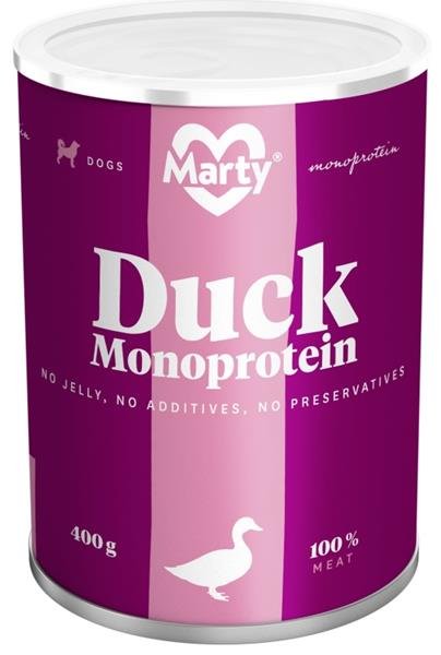MARTY Monoprotein Kachní maso. Jednosložková krmná surovina pro psy ve formě 100% čistého kachního masa nabízí psovi možnost stravy z čistého masa bez jakéhokoliv zatížení přidanými konzervanty nebo jinými přísadami. Přítomnost čistě kachního masa neutralizuje riziko alergické reakce na případné jiné druhy masa.