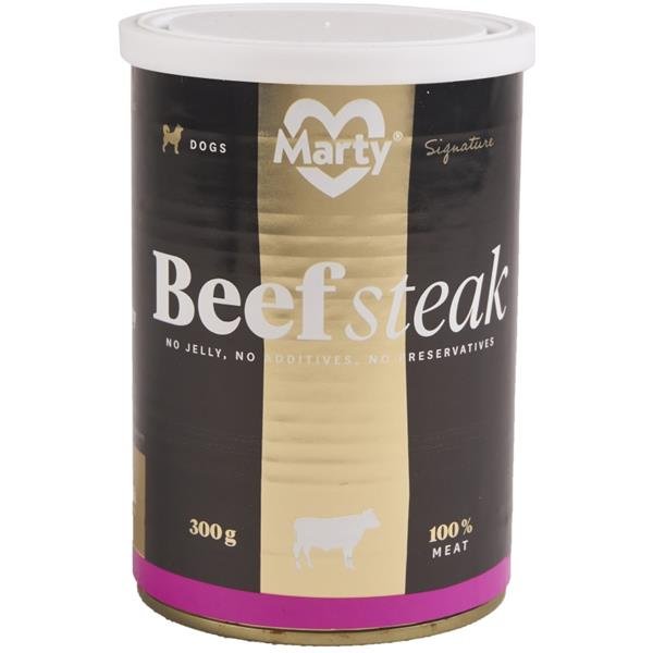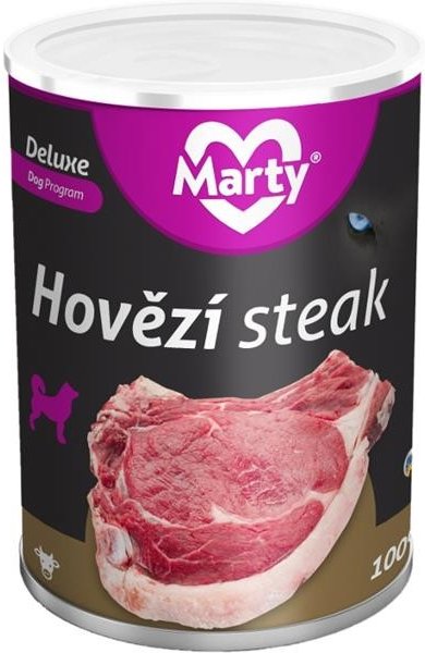 MARTY DeLuxe konzerva - hovězí steak. Jednosložková krmná surovina pro psy ve formě kusů hovězího masa (steaky) nabízí psovi možnost stravy z čistého a 100% masa bez jakéhokoliv zatížení přidanými konzervanty nebo jinými přísadami.