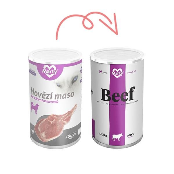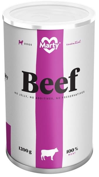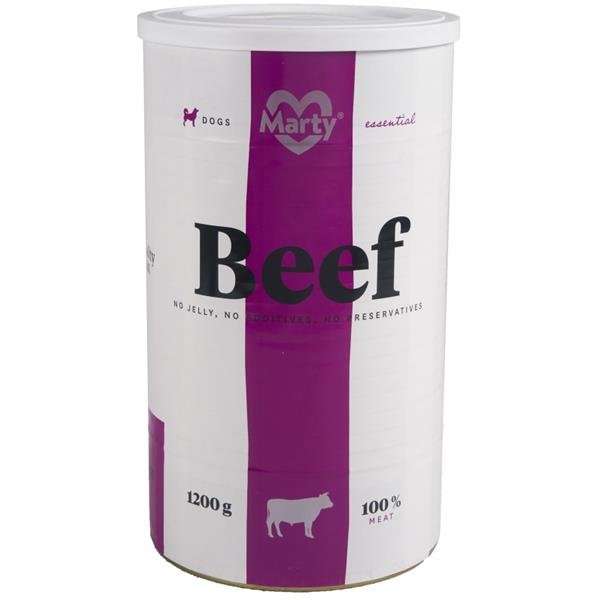 MARTY konzerva pro psy ze 100% masa - hovězí. Nabízí psovi možnost stravy z čistého a stoprocentního masa bez zatížení konzervanty a dochucovacími či barvícími přísadami. Krmivo neobsahuje sóju, mouku, rýži ani jiné přísady.