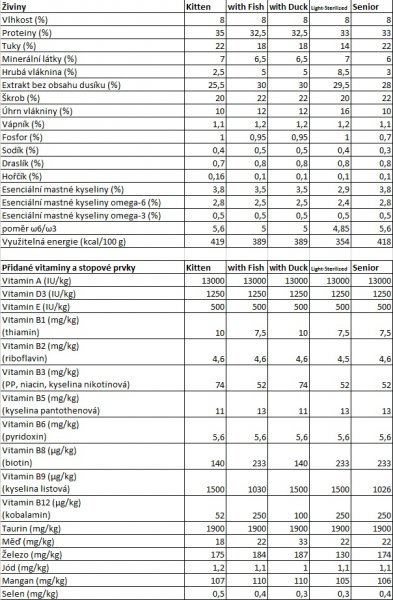 ANALÝZA: proteiny 32,5 %, tuk 18 %, popel 6,5 %, vláknina 5 %, esenciální mastné kyseliny 3,5 %, metabolizovatelná energie 389 kcal/100g.