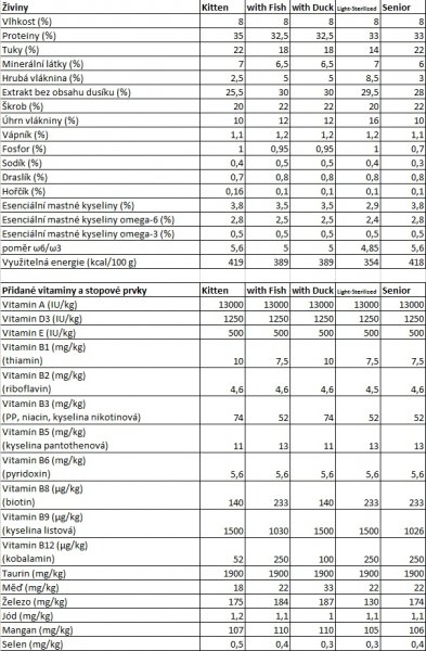SLOŽENÍ : dehydratovaná vepřová a drůbeží bílkovina, kukuřice, živočišné tuky, pšenice, kukuřičné proteiny, fazolové lusky, hydrolyzované bílkoviny z vepřového a drůbežího, dehydratované ryby (min. 4 %), minerály, řepná dužnina, sušená vejce, lněné semínko, lignocelulóza, pšeničné otruby, celý hrách, fruktooligosacharidy (0,27 %). ADITIVA: Přidané nutriční látky na kg, z toho : vit. A 13000 IU, vit. D3 1250 IU, vit. E 500 IU, oxid zinečnatý 100 mg, oxid manganatý 100 mg, síran měďnatý pentahydrát 60 mg, jodičnan vápenatý 1 mg, taurin 1900 mg. Pojiva : E558/Montmorillonit (jíl) 5 g/kg. Přidané látky : Antioxidanty. Bez přidaných umělých barviv a příchutí.