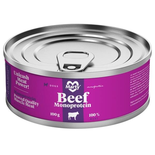 MARTY konzerva pro psy ze 100% masa se vyznačuje stoprocentní živočišnou složkou bez obsahu rýže, sóji, brambor, ale ani přidaných konzervantů. Obsah konzervy je složen ze 100 % mletého masa obsahující pouze maso a vedlejší živočišné produkty ze zvířete uvedeného na obalu. Toto krmivo tak respektuje přírodu a vašeho masožravého miláčka umožňuje krmit opravdu masem, navíc i v případě, že je pes alergický na určitý druh masa! Před výrobou těchto krmiv navíc čistíme veškeré vybavení tak, aby nebyly přítomny ani stopy jiných druhů masa.