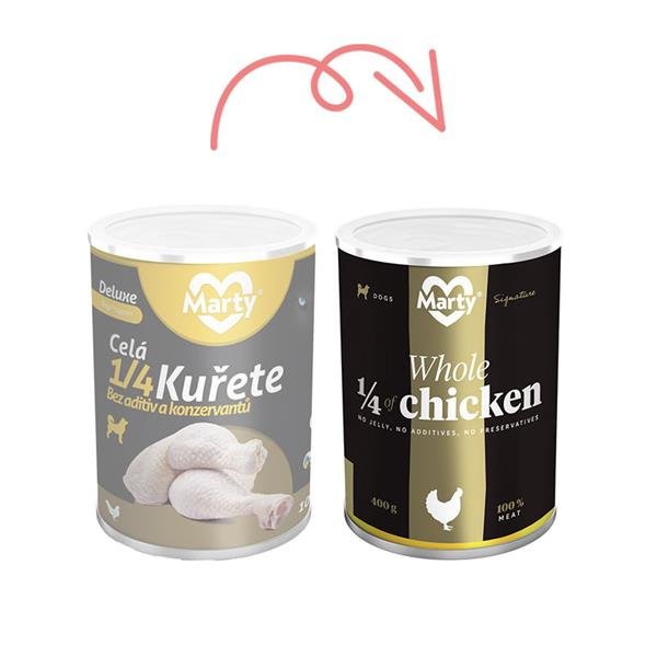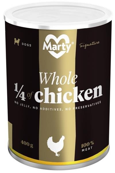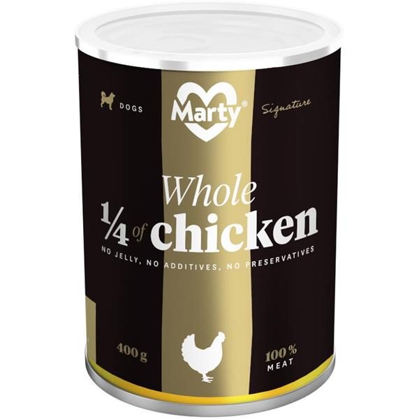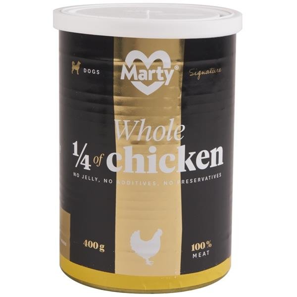 MARTY DeLuxe konzerva – celá ¼ kuřete nabízí psovi možnost stravy z čistého a 100% masa bez zatížení konzervanty a dochucovacími či barvícími přísadami. Krmivo neobsahuje sóju, mouku, rýži ani jiné přísady.