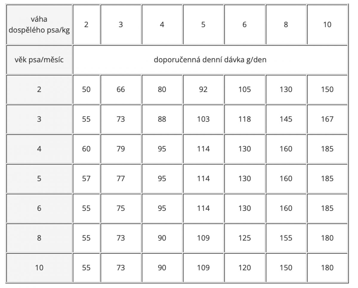 Pro štěňata od 8 týdnů do 12 měsíců, namočte do teplého mléka nebo vody několik minut před krmením. Denní krmná dávka by měla být rozdělena do 3 – 4 porcí a může být měněna s ohledem na potřeby štěněte. Březí a kojící feny: zvyšujte běžnou denní dávku od začátku o 10%, následně pak v posledním týdnu březosti o 25% a udržujte zvyšování dávky během celé březosti. Vždy zajistěte čerstvou vodu.