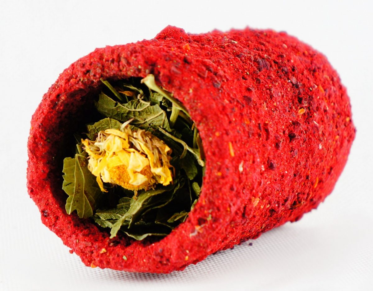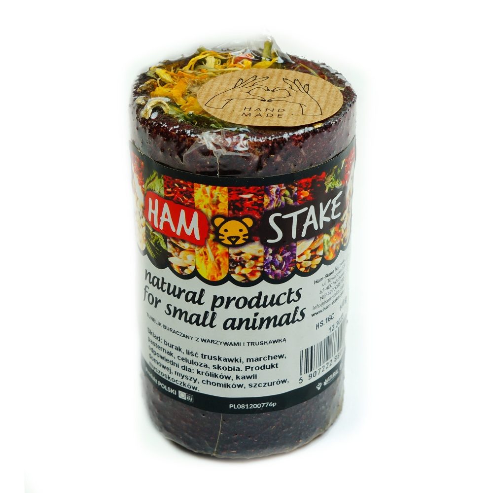 Tunel z celulózy obalený kousky sušené červené řepy a naplněný z jednoho konce zeleninou a z druhého konce listy červeného rybízu. Zábavný pamlsek zejména pro králíky, morčata, činčily, osmáky, ale také křečky, potkany, myši a další hlodavce. Složení: