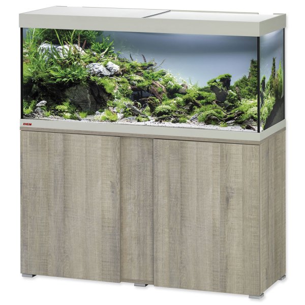 Skleněné akvárium s LED osvětlením 1 x 20W, filtrem ecco pro 300, 150W topítkem a skříňkou. Velikost: 121 x 41 x 124 cm.