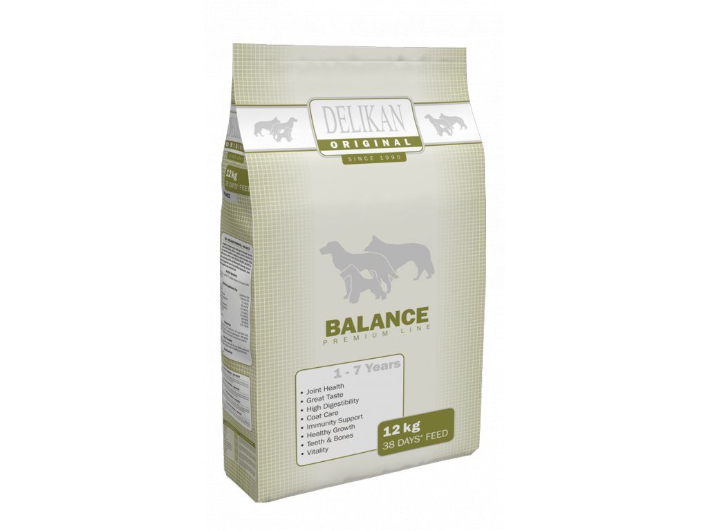 Kompletní prémiové krmivo pro dospělé psy všech plemen. Krmivo obsahuje sušené drůbeží maso, které je jedinečným zdrojem obsahu bílkovin. Obsah bílkovin a tuků je přizpůsobený potřebám psů s normální aktivitou. DELIKAN ORIGINAL BALANCE výborně pokrývá veškeré potřeby psa, proto k němu není nutné přidávat jakékoli doplňky. Bez sóji, barviv a chemických konzervantů.