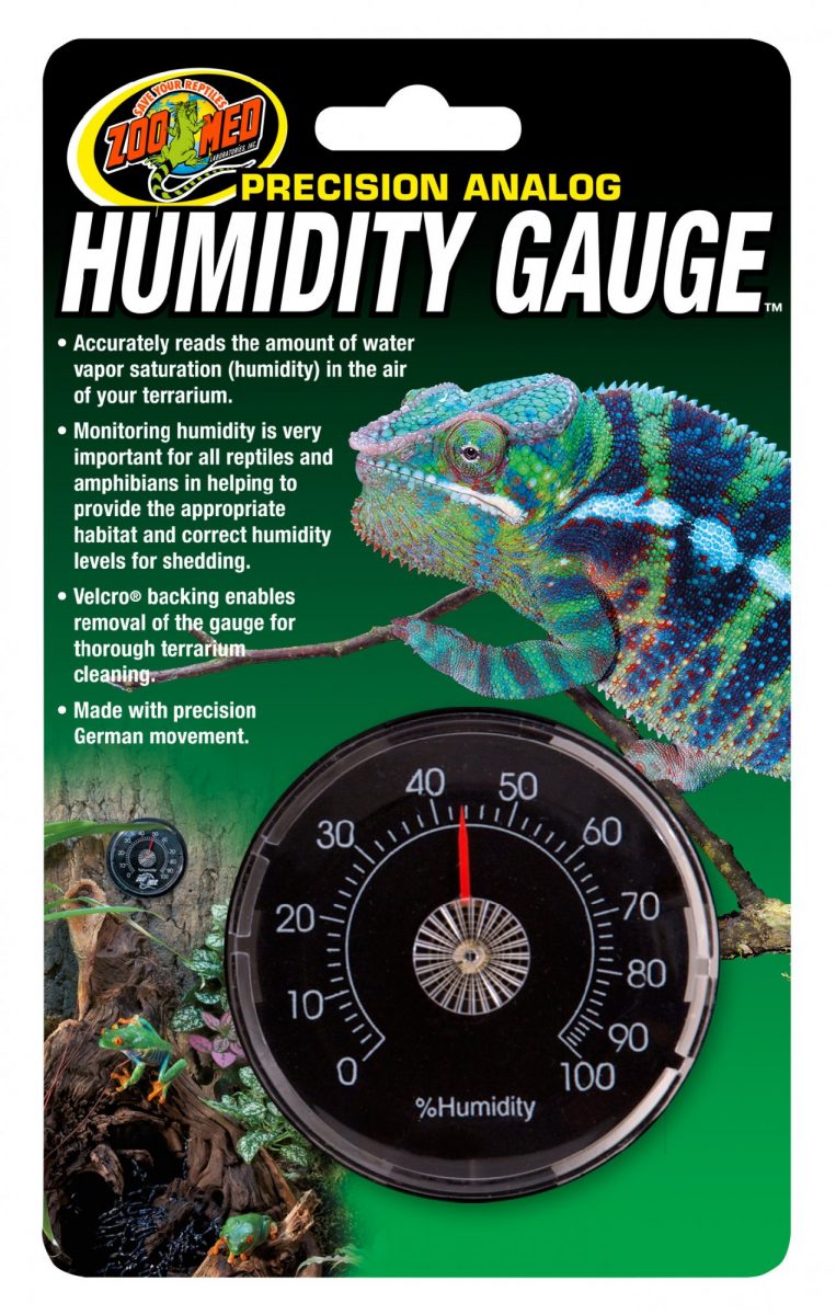 Zoo Med analogový terarijní vlhkoměr. Přesně čte sytost vodní páry (vlhkost) v ovzduší terária. Pohybuje se v rozmezí od 0 do 100%.