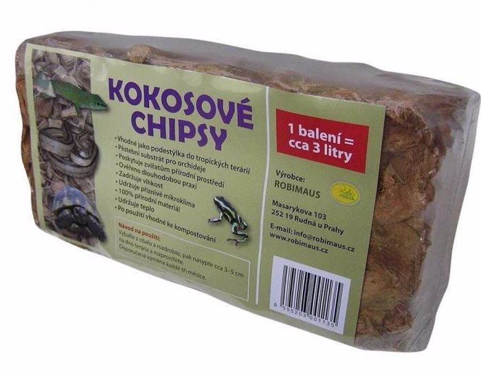 kokosové chipsy mají univerzální použití v polovlhkých i vlhkých teráriích, díky své jemnosti a čistotě se hodí jako podklad pod většinu terarijních zvířat.