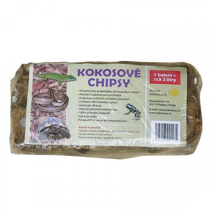 Čisté kokosové chipsy o velikosti 1 - 4 cm jsou vhodné jako podestýlka do polosuchých i vlhkých terárií. Výborně se hodí jako příměs do substátů pro orchideje. 100% přírodní materiál. Obsah balení cca 3 litry.