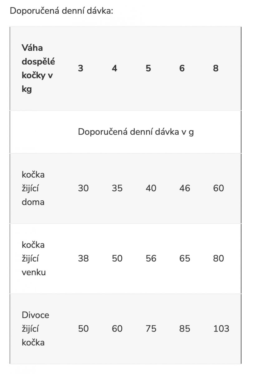 krmivo může být volně k dispozici. V případech obezity či nemoci doporučujeme řídit se pokyny veterináře nebo následující tabulkou. Je zapotřebí po celý den zajistit přístup k čisté, pitné vodě.