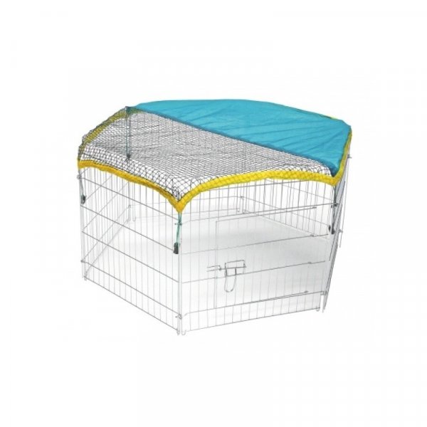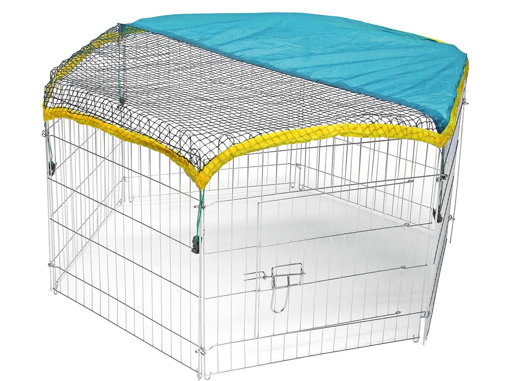součástí výběhu jsou dvířka, plachta chránící před sluncem a ochranná síť