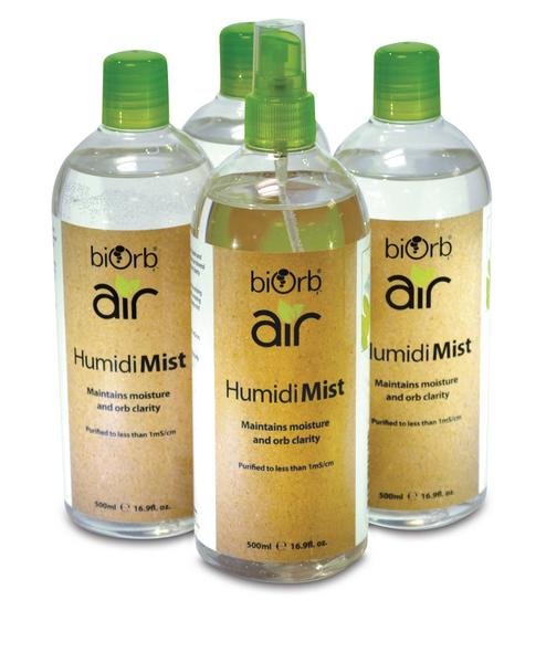 Humidimist je přípravek vyrobený speciálně pro použití v teráriích biOrb AIR 60. Obsahuje nízké množství rozpuštěných látek, takže zamlžovací jednotka bude pracovat správně jak má. Při použit normální vody se vystavujete nebezpečí zanesení zamlžovací jednotky a následně celého terária. Destilovaná voda zase není vhodná kvůli tomu, že neobsahuje žádné rozpuštěné látky a ultrazvukový senzor pro detekci nízké hladiny vody v zamlžovači nebude správně pracovat.