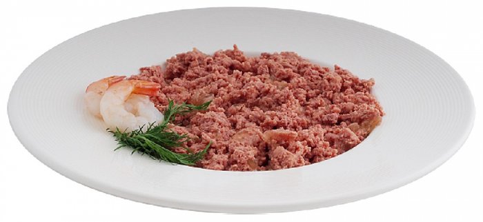 Složení: maso a masné vedlejší produkty (krůtí 66%), vývar 28,9%, ryby a vedlejší produkty z ryb (krevety 4%), minerály 1%, tuky a oleje (lososový olej 0,1%)
