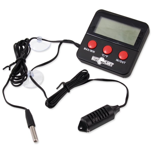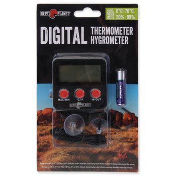 Terarijní teploměr/vlhkoměr s extra dlouhým kabelem, umožňujícím flexibilní umístění snímače.