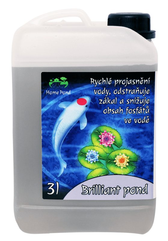 Brilliant Pond = přípravek proti neprůhledné vodě, balení 3 l, tekutý, k rozjasnění, odstranění zelené vody a zákalů v jezírku, dávkování 20 - 30 ml/m3.