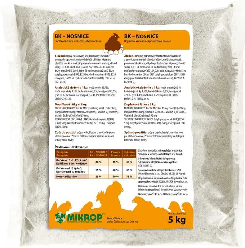 Obsahuje vysoký obsah dusíkatých látek a esenciálních aminokyselin z vysoce kvalitního sójového extrahovaného šrotu. Minerální krmivo zajistí dostatečný obsah Ca, P, Na a dalších důležitých prvků pro kvalitní výživu nosnic v době snášky.