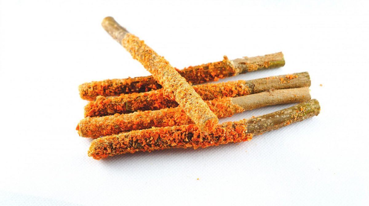 Přírodní pamlsek z mladých lískových větviček obalených chutnou sušenou mrkví.