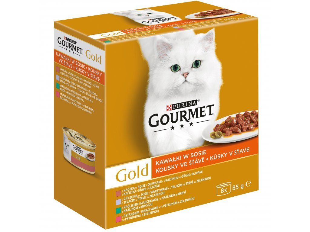 Kompletní, superprémiové krmivo Gourmet Gold konzervy pro dospělé kočky všech plemen, s obsahem masa a zeleniny