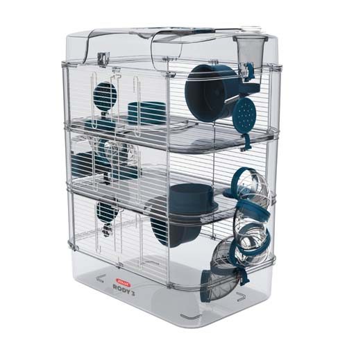 Klec RODY 3 Trio má 3 úrovně a příslušenství: 2x kolotoč, 1 napáječka, 2x miska, 1 domeček, 7 dílů pro sestavení tunelu, 4 krytky otvorů