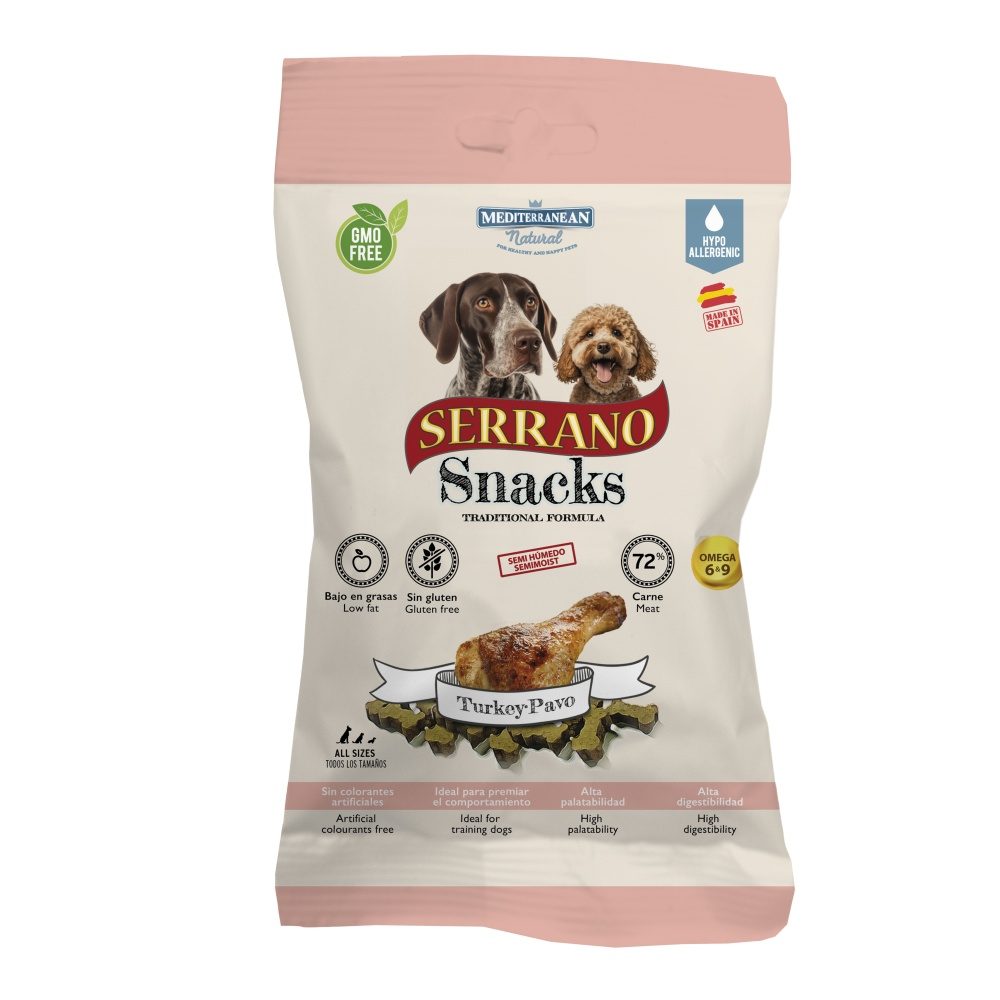 Mediterranean Natural Serrano Snacks, pamlsky delikátně rozkrájené na malé kousky ve tvaru kosti, zaručují bezpečnost vašeho čtyřnohého přítele, přičemž zachovávají všechny živiny, respektují přirozenou stravu a obsahují 70% čerstvého masa. Jsou bez lepku, neobsahují umělé barviva, neobsahují GMO ani trans-mastné kyseliny. Jsou hypoalergenním produktem s přírodním zdrojem mastných kyselin. Jedná se o dokonalým pamlskem k odměnění vašeho mazlíčka za dobré chování. Sáček je možné opětovně uzavřít pomocí vzduchotěsného uzávěru. To ochrání živiny a udrží je v dobrém stavu.