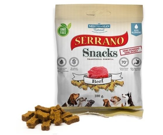 Mediterranean Natural Serrano Snacks, pamlsky delikátně rozkrájené na malé kousky ve tvaru kosti, zaručují bezpečnost vašeho čtyřnohého přítele, přičemž zachovávají všechny živiny, respektují přirozenou stravu a obsahují 70% čerstvého masa.