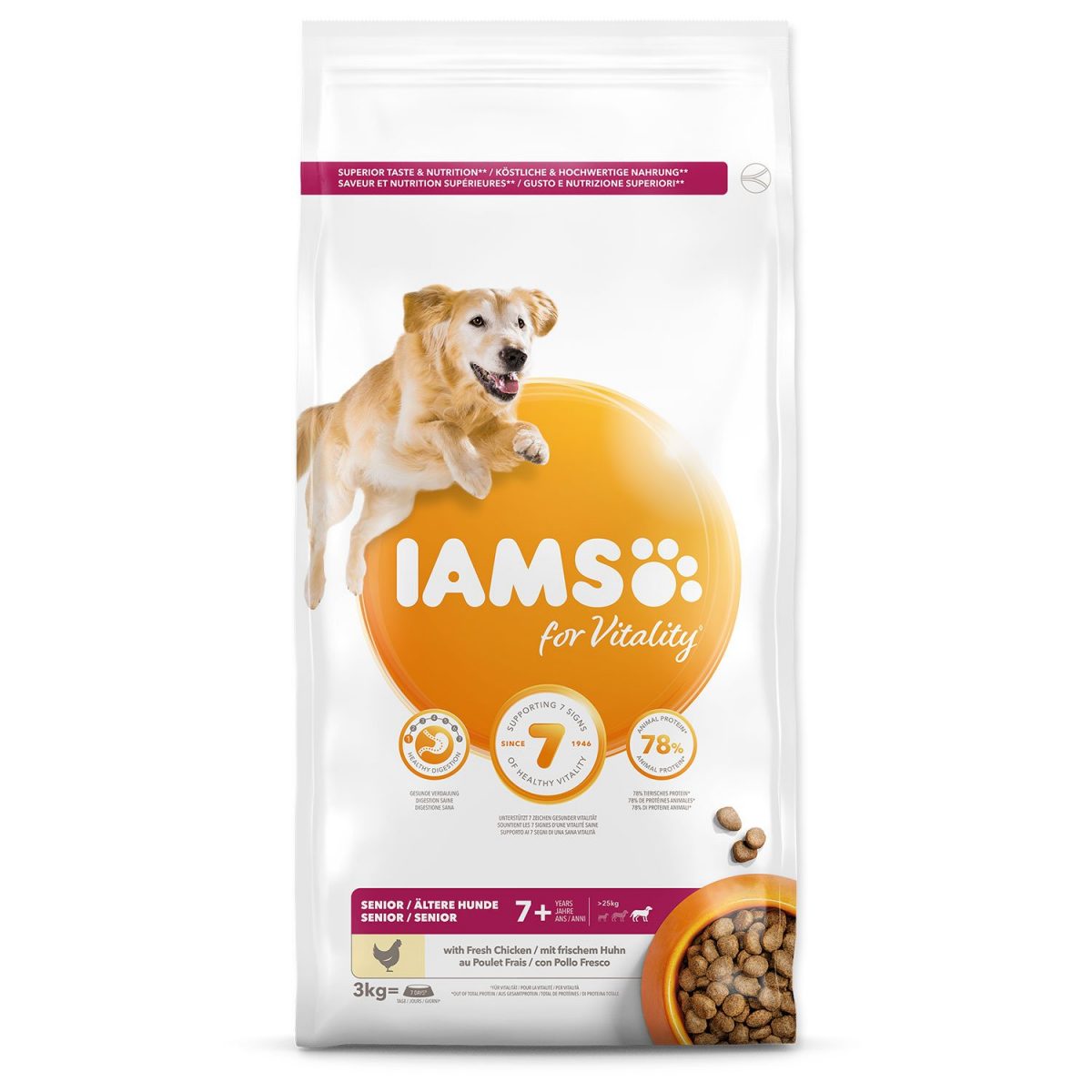 Krmivo IAMS for Vitality pro psí seniory velkých plemen je 100% kompletní a vyvážené, odborníky sestavené krmivo, které bude vašemu zvířeti chutnat a svědčit. Naše nová a vylepšená receptura pro psí seniory s čerstvým kuřecím masem je založena na pečlivě vybraných, kvalitních živočišných bílkovinách, které podporují sedm znaků zdravé vitality psa. Aby byl váš pes zdravý, aktivní a plný energie, obsahují naše lahodné receptury až 78 % živočišných bílkovin (z celkového obsahu bílkovin). Umožněte svému mazlíčkovi užívat si každý den naplno!