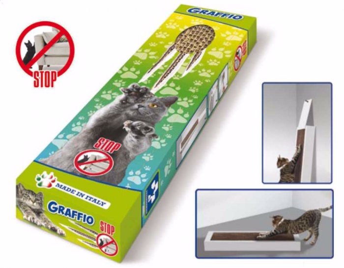 Škrábadlo Graffio je vtipně řešené s minimální zátěží na prostředí. Škrábadlo tvoří papírová krabice, která po otevření slouží jako součást škrábadla.