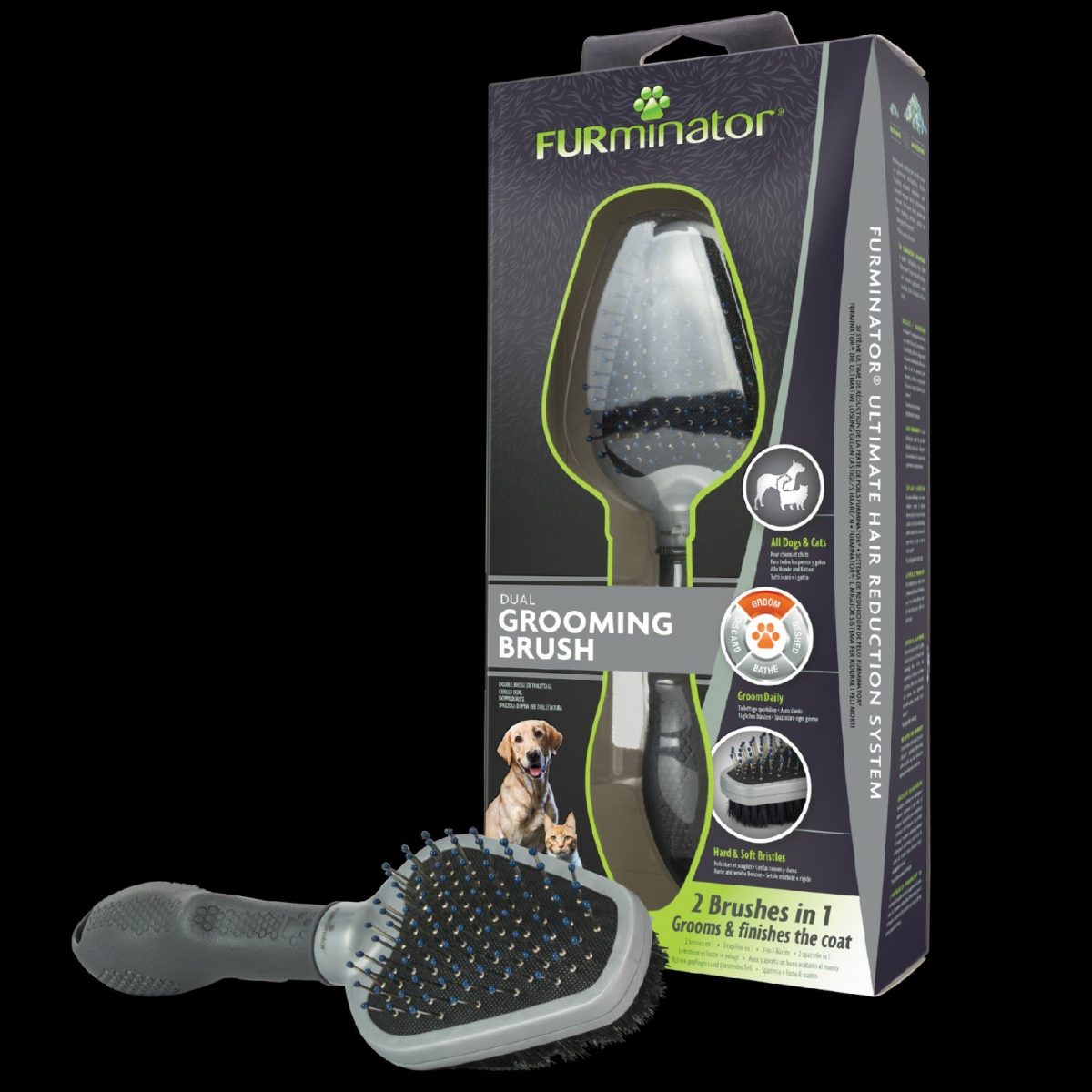 Duální kartáč FURminator s hlavicí se dvěmi typy štětin. Kartáč 2v1 má tvrdé a měkké štětiny pro každodenní péči o srst. Slouží k rozčesávání a odstraňování uvolněné zvířecí srsti. Hřeben je možné používat denně podle potřeby. Praktický doplněk pro všechny chovatele chlupatých mazlíčků, kteří dbají na zdravou a krásnou srst svého chlupáče. Ergonomická rukojeť chrání proti skluzu kartáče z ruky.