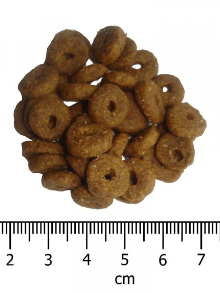 Analytické složky: Hrubý protein 31,5 %, hrubý olej a tuky 16,5 %, mastné kyseliny omega 6: 3 %, mastné kyseliny omega 3: 0,9 %, hrubá vláknina 2,3 %, celková dietní vláknina 6,5 %, hrubý popel 6,9 %, vápník 1,3 %, fosfor 1,1 %, vlhkost 9 %. Doplňkové látky v 1 kg: Vitamín A 18.000 M.J. / mg, Vitamín D3 1.1.500 M.J. / mg, Vitamín E 750 mg, Vitamín C 75 mg, L-taurin 975 mg, DL-methionin 500 mg, železo (síran železnatý monohydrát) 100 mg, jód (jodid draselný) 3,5 mg, měď (síran mděďnatý pentahydrát) 10 mg, mangan (síran manganatý monohydrát) 8 mg, zinek (oxid zinečnatý) 155 mg, selen (seleničitan sodný) 0,2 mg, exktrakt z juky 150 mg, citrusové extrakty bohaté na bioflavonoidy 1.000 mg. Technologické přísady: chráněno přírodními antioxidanty (tokoferoly) s protistárnoucím účinkem, odstraněním volných radikálů (způsobujících nádorový růst).