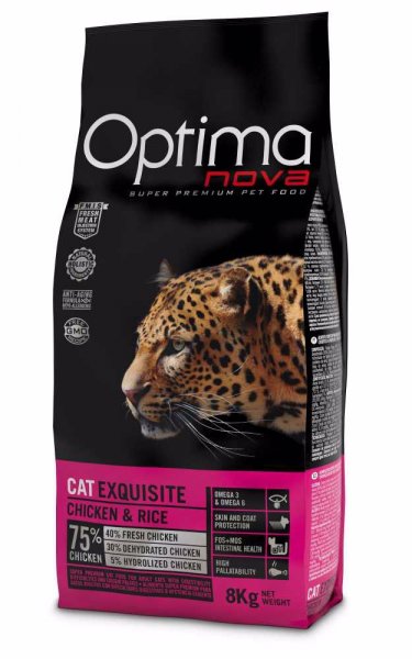 Přírodní superprémiové krmivo pro náročné dospělé kočky. OPTIMAnova Cat Exquisite složené z kvalitních bílkovin a lehce stravitelných sacharidů v kombinaci s prospěšnými tuky. Krmivo obohacené o vitamíny, minerální látky a antioxidanty. Jako jediný zdroj živočišných bílkovin s vyváženým poměrem bílkovin a tuku je použito kuřecí maso - monoproteinová strava výrazně snižuje riziko vzniku intolerancí a potravinových alergií. Snadno stravitelné sacharidy, pro zajištění kvalitní srsti, kůže a podporu trávení. Obsah omega 3 a 6 esenciálních mastných kyselin pro správné fungování mozku a optimální kondici kardiovaskulárního systému. Obsah zinku napomáhá udržovat zdravou kůži a lesklou srst. FOS + MOS s prebiotickými účinky přispívá ke zdraví trávícího traktu. Vysoká kvalita různých druhů masa, olejů a extraktů dělá krmivo velmi chutné i pro vybíravé kočky. Obsahuje pouze přírodní konzervanty a antioxidanty