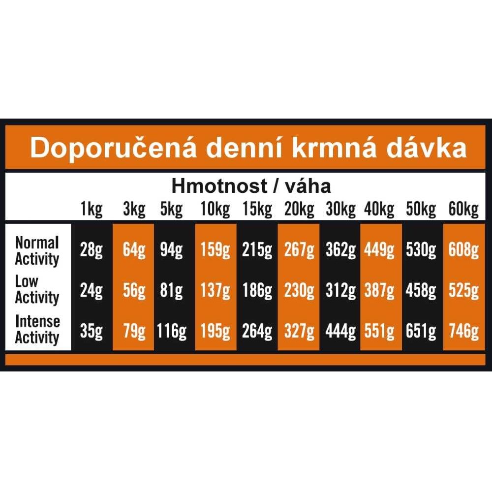 Analytické složky: Hrubý protein 27 %, hrubý olej a tuky 16 %, EPA+DHA 2.550 mg / kg, hrubá vláknina 2,75 %, hrubý popel 7,5 %, vápník 1,10 %, fosfor 0,85 %.