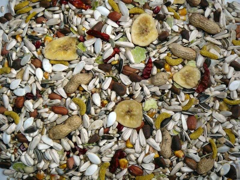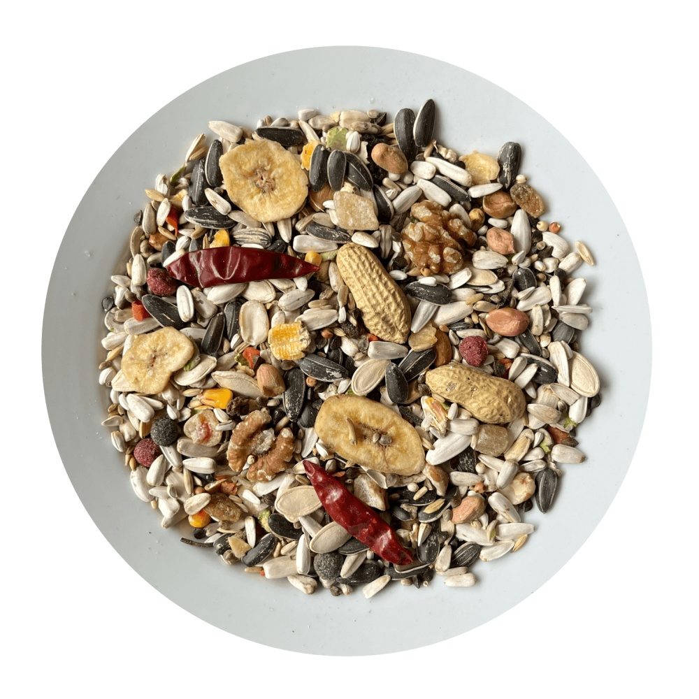 Kompletní krmivo pro velké papoušky. Krmivo může být vloženo do obalu pro malé papoušky - náhradní obal. Výběrová směs zrnin pro velké papoušky se spoustou oříšků, ovoce, zeleniny a chilli papriček. Krmný návod: podávejte denně přiměřené množství. Složení: slunečnice bílá, kardi, oves nahý, kukuřice žlutá, dýně, burské oříšky ve slupce, burské oříšky loupané, slunečnice bílá Kenya, dari, lesknice, čirok červený, pohanka, kukuřice červená, ostropestřec, mungo, semenec, banány, kukuřičné vločky, slunečnice žíhaná velká, soja, hrachové vločky, extrudovaná rýže, chilli papričky.