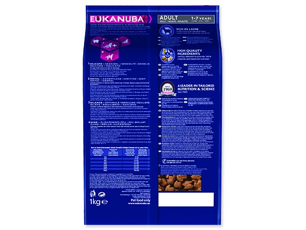 Kompletní krmivo pro psy ve věku od 1 do 7 let s váhou do 25 kg. Jehněčí maso představuje velmi dobře stravitelnou výživu, vhodnou i pro citlivé psy. Krmivo značky Eukanuba poskytuje optimální denní dávku proteinů, tuku, karbohydrátů, důležitých vitamínů a minerálů pro zdraví a pohodu vašeho psa. Obsahuje přísady vysoké kvality a velké množství živočišných proteinů.