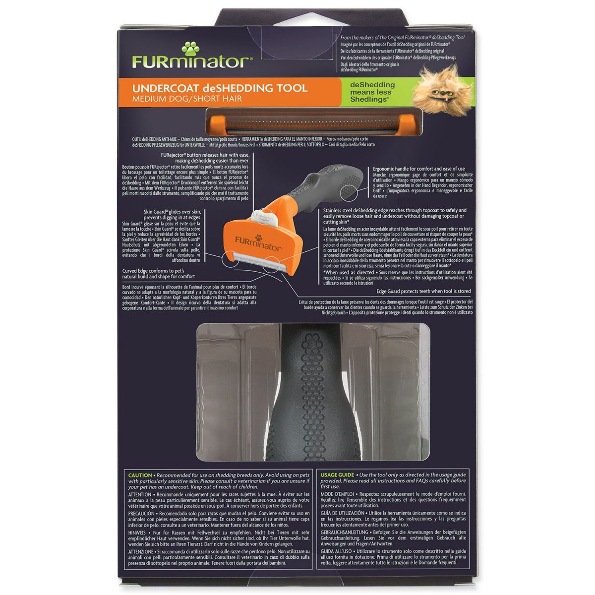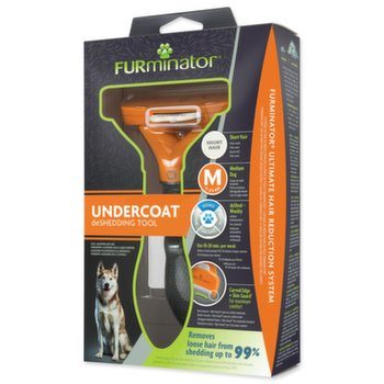 FURminator® hrablo k vyčesávání podsady pro krátkosrsté psy středních plemen o hmotnosti 9-23 kg odstraňuje až 99 % uvolněných chlupů.