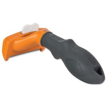 - Vyčesávací hrana z nerezové oceli proniká hluboko do srsti zvířete, kde šetrně a lehce odstraňuje uvolněné chlupy z podsady, aniž by poranila kůži nebo poškodila srst