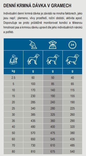 Individuální denní krmná dávka je závislá na mnoha faktorech, jako jsou např.: plemeno, vlivy prostředí, roční období, aktivita apod. Doporučuje se proto průběžně monitorovat kondici a tělesnou hmotnost psa a krmnou dávku upravit dle jeho individuálních nároků a potřeb.