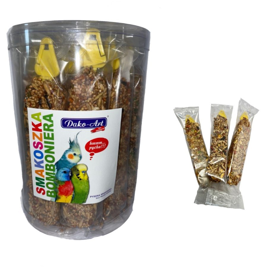 bombonierka - tyčinka andulka složení : směs semen a sušeného ovoce příchutě: 2x kiwi 2x ovocná 2x medová 2x sušenka 2x jablečná 2x malina balení : 2ks mix příchutí