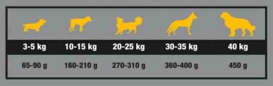 Způsob podávání: Změnu krmiva je potřeba provádět postupně po dobu 7 dní. Podávejte denní krmnou dávku nejlépe rozělenou na 2 až porce denně, a to vždy ve stejnou dobu. Krmné množství se může lišit v závislosti na aktivitě, psím plemeni a podmínek okolního prostředí. Pes musí mít vždy k dispoziíci čistou a čerstvou vodu.Skladujte na chladném a suchém místě.