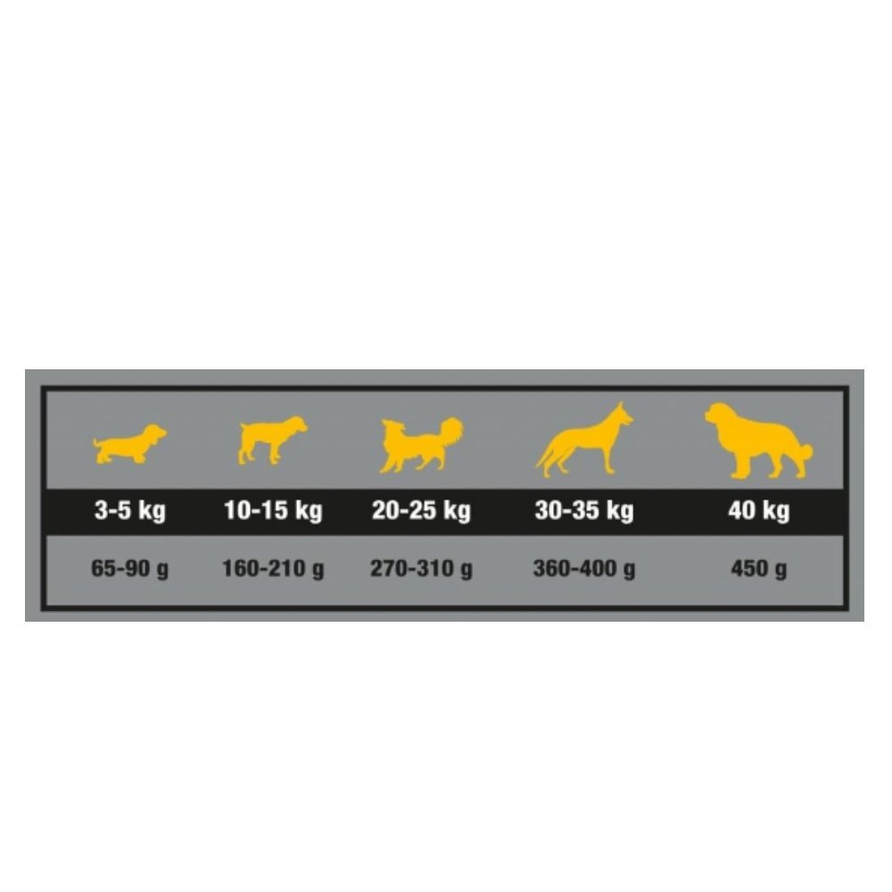 Způsob podávání: Změnu krmiva je potřeba provádět postupně po dobu 7 dní. Podávejte denní krmnou dávku nejlépe rozělenou na 2 až porce denně, a to vždy ve stejnou dobu. Krmné množství se může lišit v závislosti na aktivitě, psím plemeni a podmínek okolního prostředí. Pes musí mít vždy k dispoziíci čistou a čerstvou vodu.Skladujte na chladném a suchém místě.